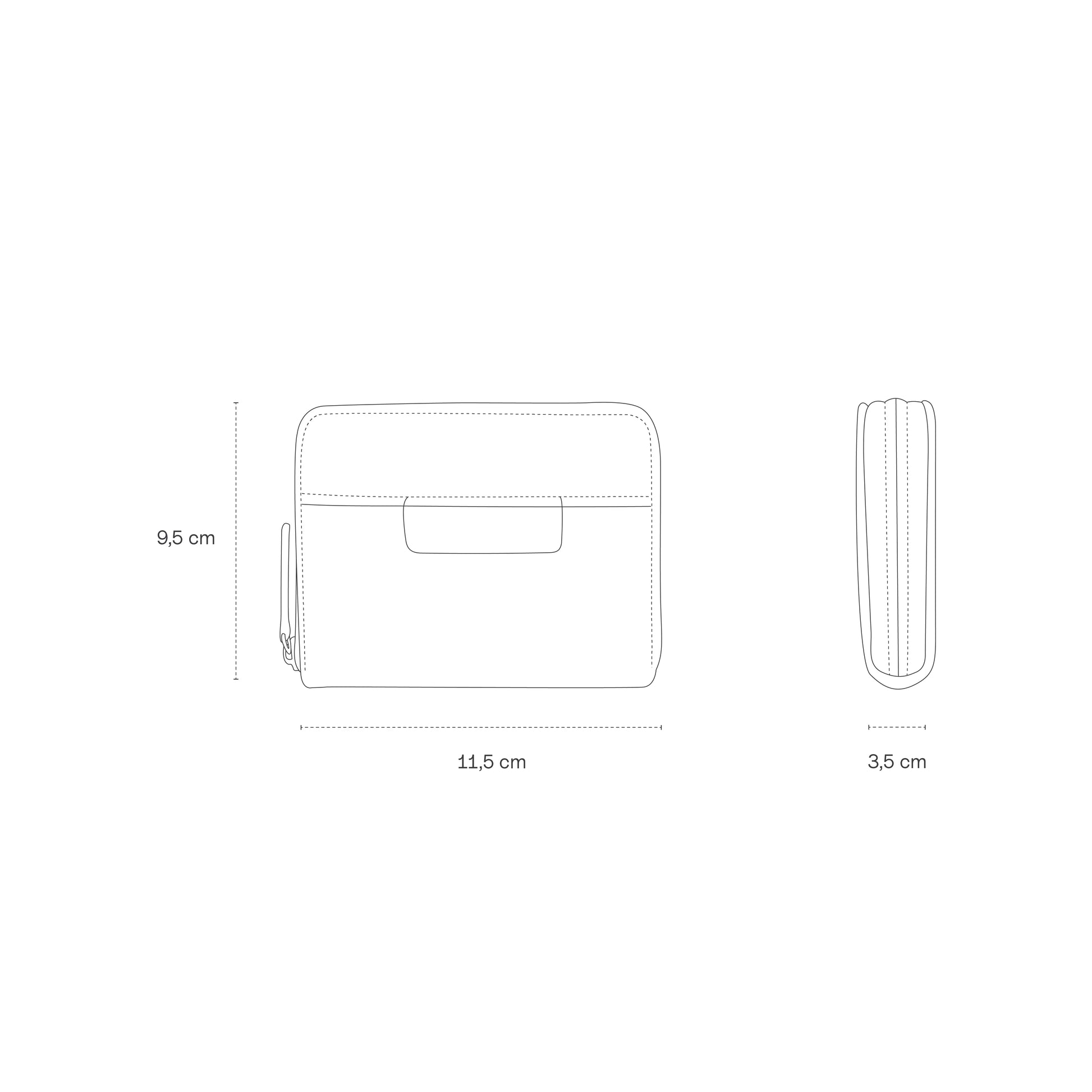 Die Geldbörse misst ca. 9,5 cm in der Höhe, 11,5 cm in der Breite und 3,5 cm in der Tiefe.
