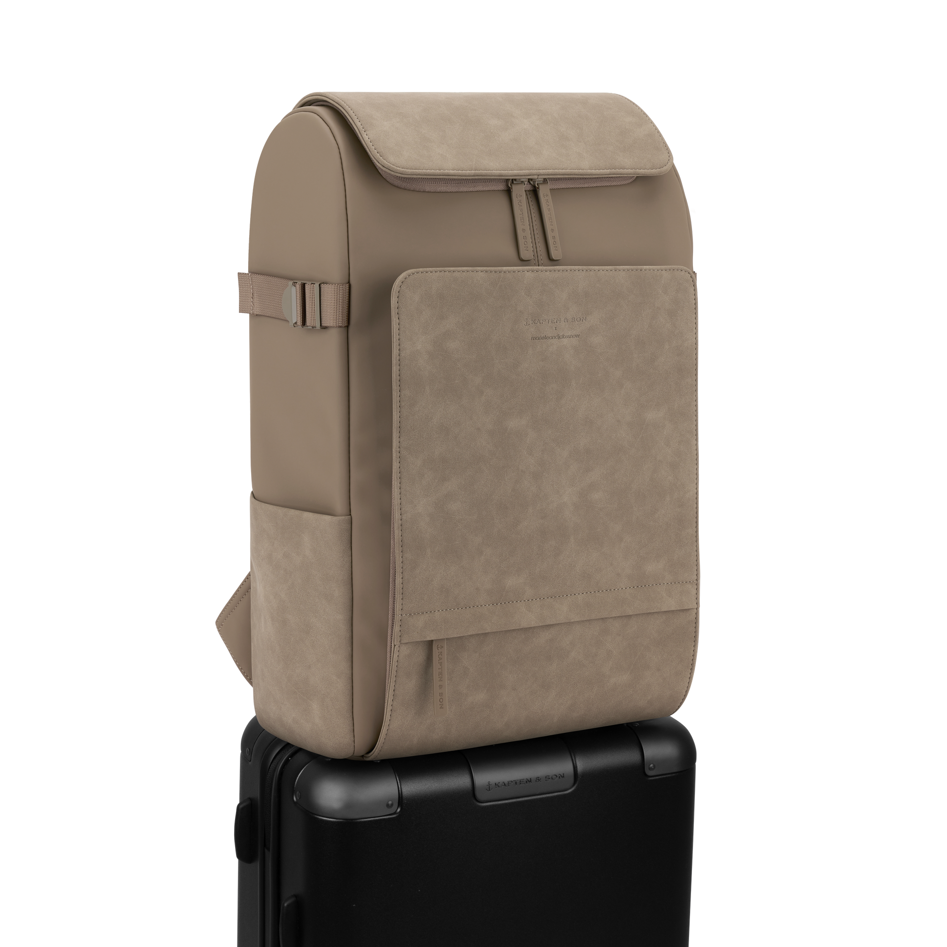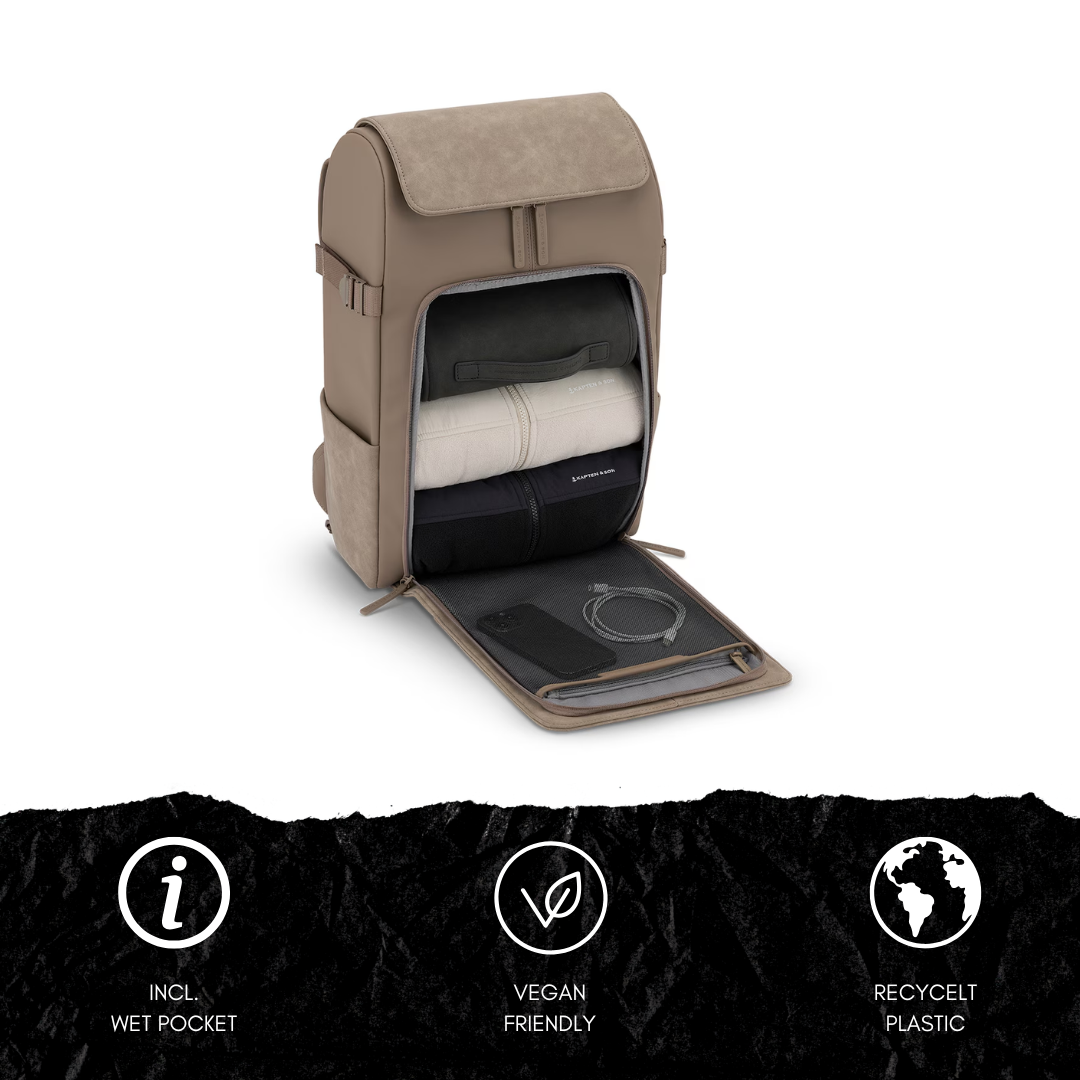 Außen- und Innenmaterial bestehen aus recyceltem PET + veganem Tech-Material – wetterfest und robust