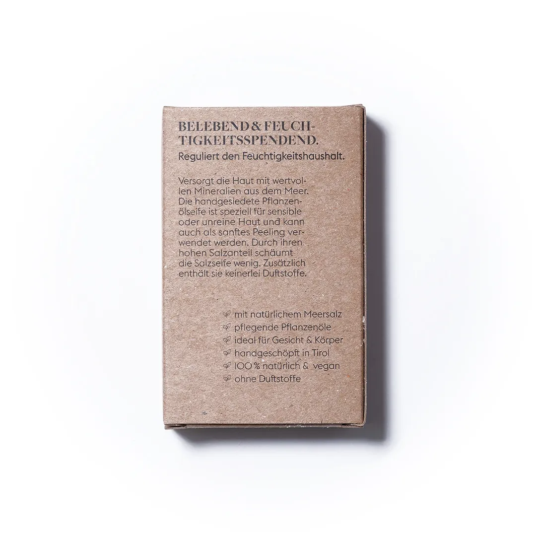 Verseiftes Kokosöl und Olivenöl reinigen. Atlantisches Meersalz gibt Mineralien und veredelt die Textur. Glycerin bewahrt die Feuchtigkeit. Die Seife schäumt dezent, bleibt sanft zur Haut – perfekt für sensible Typen.