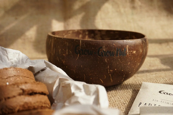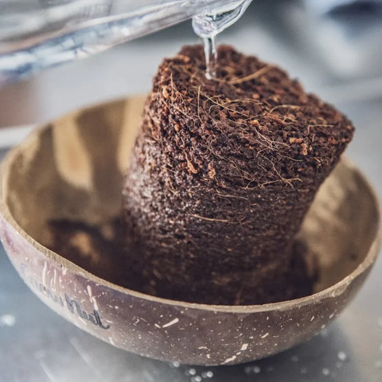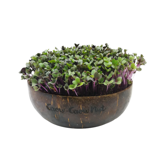 Die Grow-Grow Nut ist ein Microgreen-Anzuchtset aus einer robusten Upcycling-Kokosnussschale, Kokoserdeziegeln und leckeren Bio-Saatgutsorten.