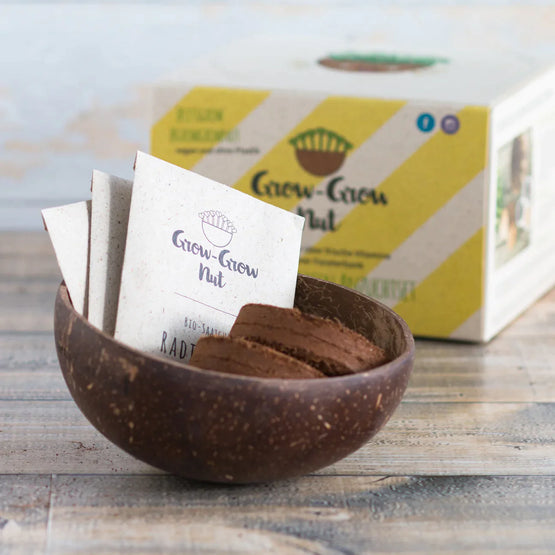 Grow-Grow Nut Anzuchtset Das erste biologisch abbaubare Microgreen-Set mit 100% Bio-Saatgut! Pflanze deine Vitamine ganz bequem auf der Fensterbank oder verschenke ein paar Sets an deine Liebsten - und genießt schon nach einer Woche und völlig ohne grünen Daumen leckere Sorten wie Brokkoli, Rucola und Radieschen.